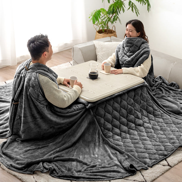 【タンスのゲン】花火大会観戦にも最適! 今までの“こたつ”の課題をこれで解決! 腕を通すアームホールと背中で留めるボタンで、こたつ布団を着用~背中までしっかりあったかく